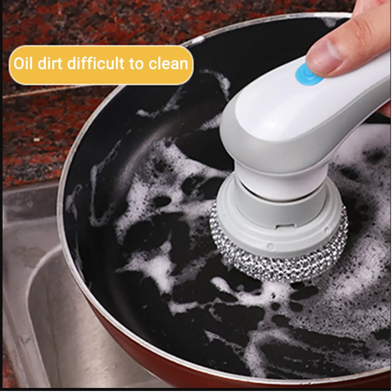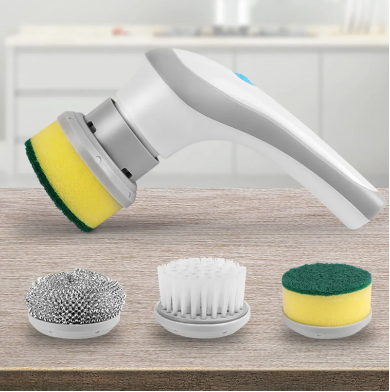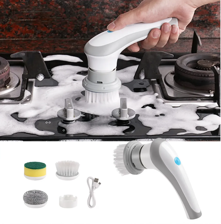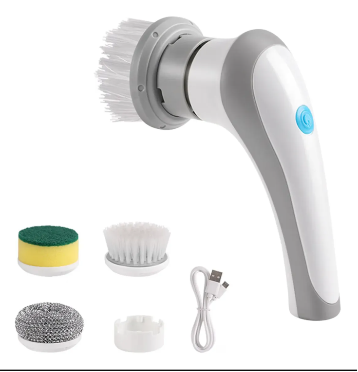 📦 Contenido del paquete: 1 cepillo eléctrico + 1 cepillo de cerdas + 1 cepillo de esponja + 1 bola de acero + 1 parche adhesivo para pared
