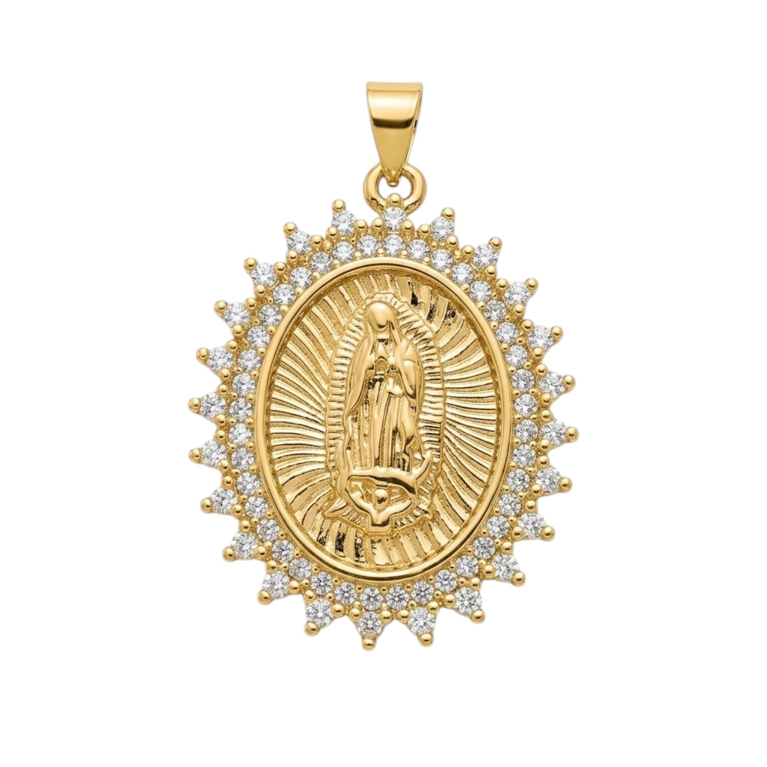 Luce un símbolo de fe, protección y elegancia con este hermoso dije de la Virgen de Guadalupe elaborado en oro laminado de 18K.