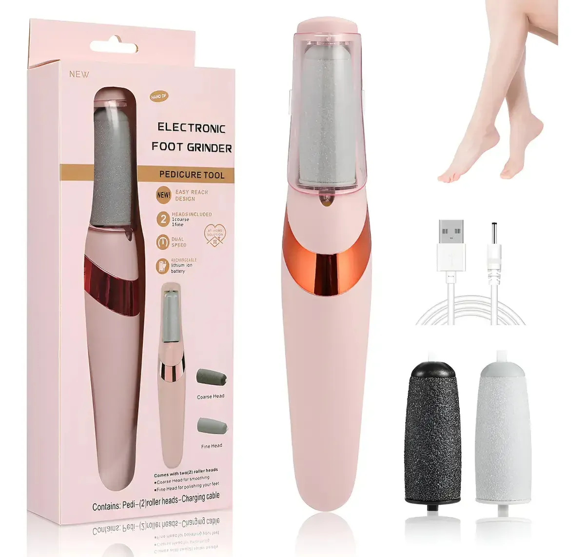 Cuenta con dos velocidades ajustables y utiliza cabezales de rodillo intercambiables (grueso y fino) para suavizar y pulir la piel seca o agrietada.