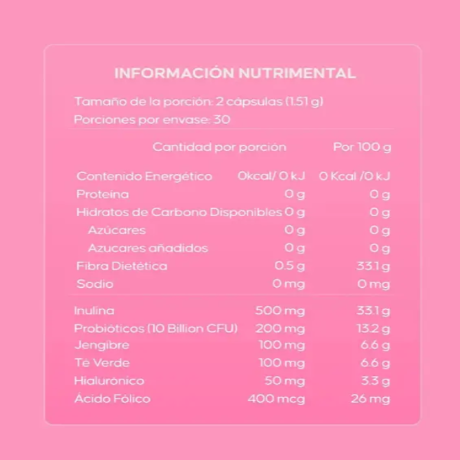 Probioticos, que te ayudarán a mejorar tu salud gastrointestinal asi como la digestión y absorción de tus alimentos. Prebioticos (inulina) que potencializara todos los beneficios de los probioticos.