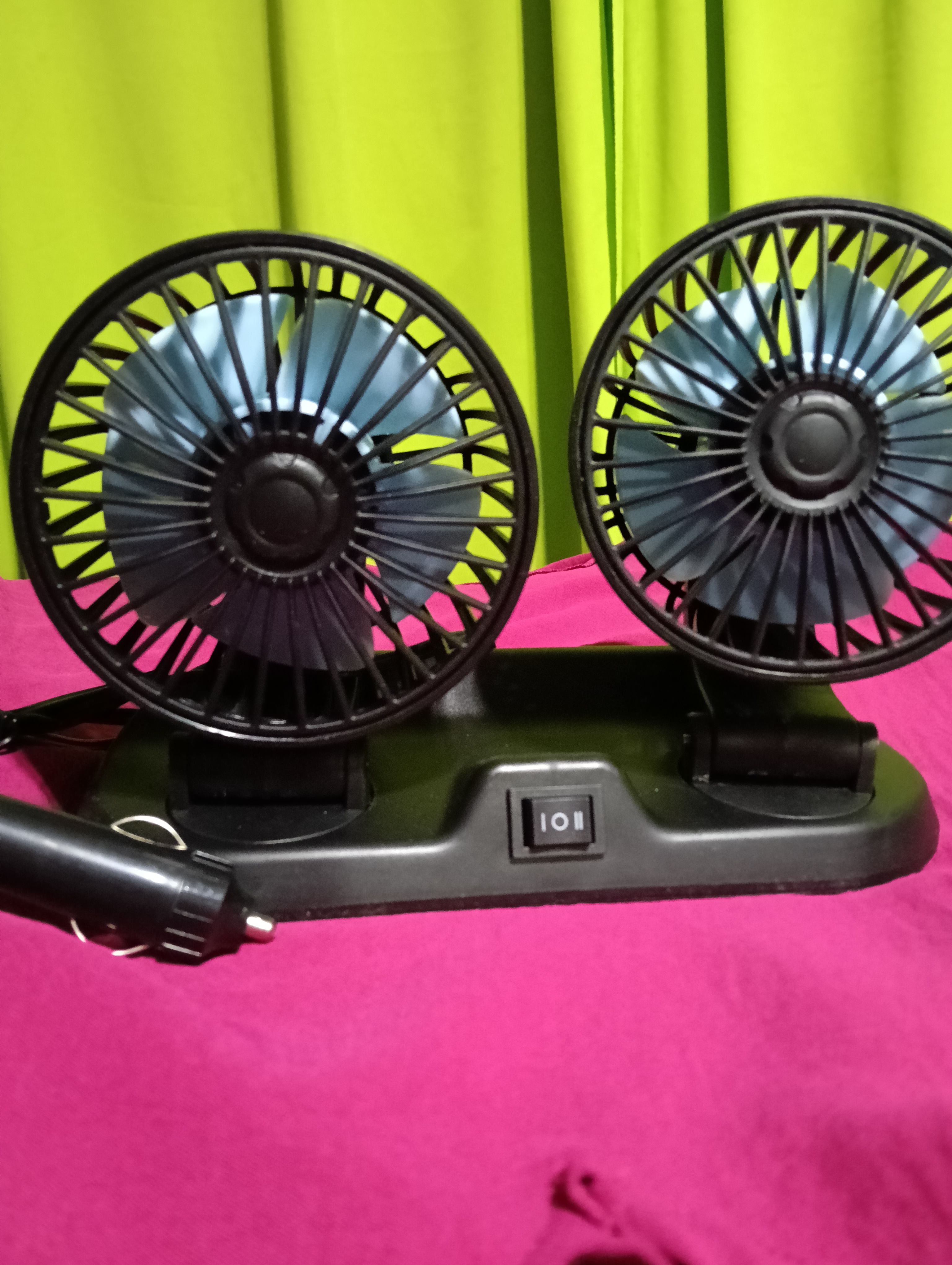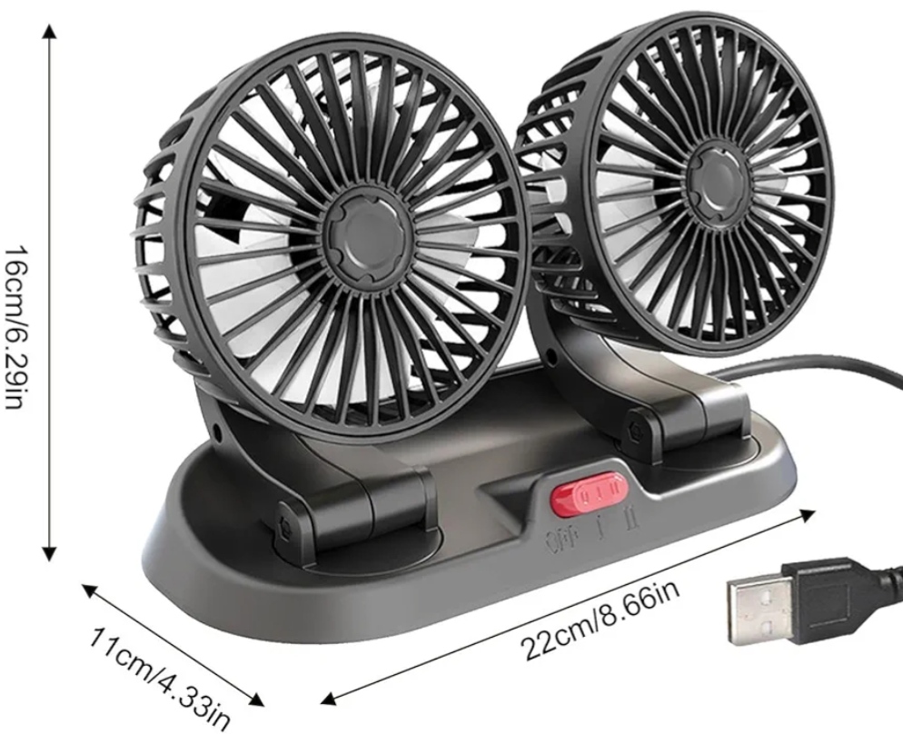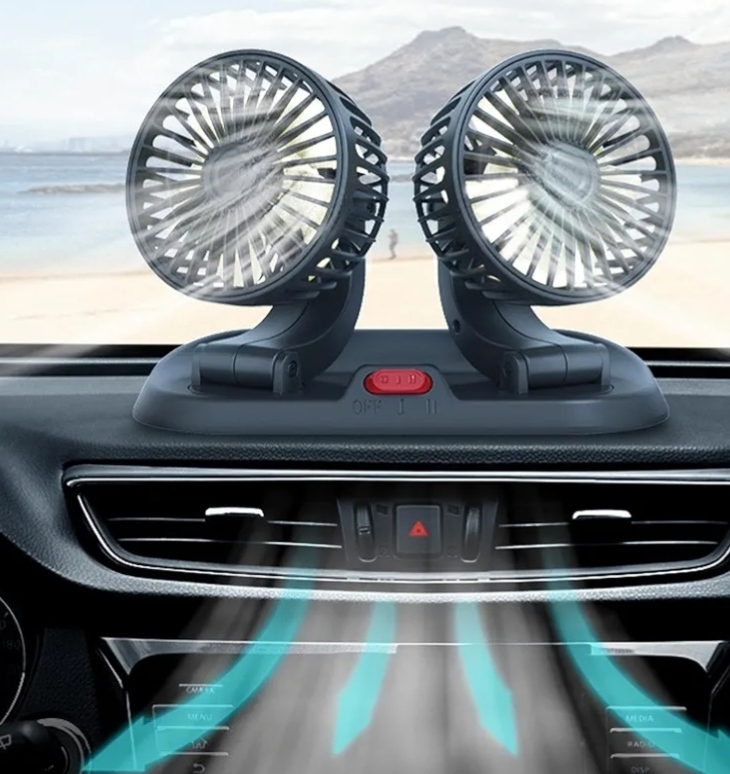 ventilador doble para automóvil diseñado para mejorar la circulación del aire y la refrigeración dentro del vehículo. Conexión encendedor 12 voltios,2 velocidades,360 grados.Cuenta con dos cabezales independientes ajustables en 360 grados, permitiendo dirigir el flujo de aire a diferentes áreas Se fija comúnmente al tablero o apoyabrazos mediante cintas adhesivas de doble cara incluidas para mayor estabilidad.